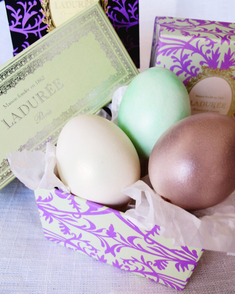 Jag rotade helt enkelt fram ett gäng skimriga ögonskuggor som ändå aldrig får se dagens ljus, och med en makeupsvamp gnuggade jag in färgpigmenten i skalen. Resultatet blev över förväntan – äggen blev skimrigt lyxiga och precis så girly som askarna krävde.