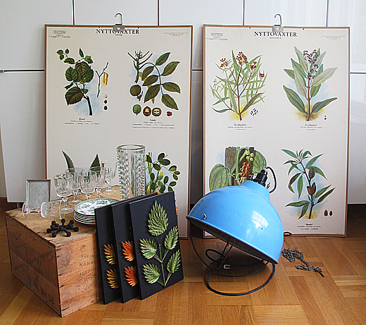 Åh, åh, åh vilka fina fynd!!! Skolplanscherna, trälådan och vinglasen finns även hemma hos mig, men jag gillade dina bättre 😉 Lampan var också superfin.