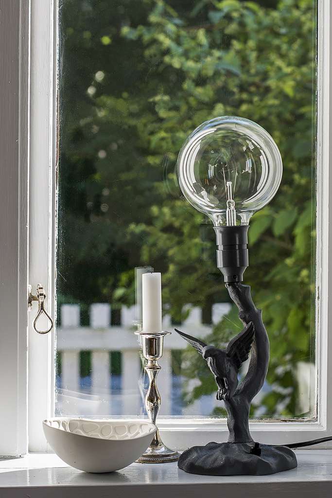 Den här lampfoten med en knubbig örn får väl sägas ha varit mer än lovligt kitschig i sin rätt vulgo-fula originalfärg (nåt slags brunt/koppar/grönt-blandning) när jag hittade den i en sån där fyndlåda under ett bord på en loppis för några år sen. Jag lät en elektriker dra om elen (obs, viktigt!), och sen gick jag lös med en granitgrå sprayfärg på hela lampfoten. Vips blev den ett ganska fint tillskott till inredningen, först i sommarhuset på Gotland (där bilden är tagen), och nu står den istället på ett linneskåp i vårt sovrum. Nytt liv, buslätt DIY.