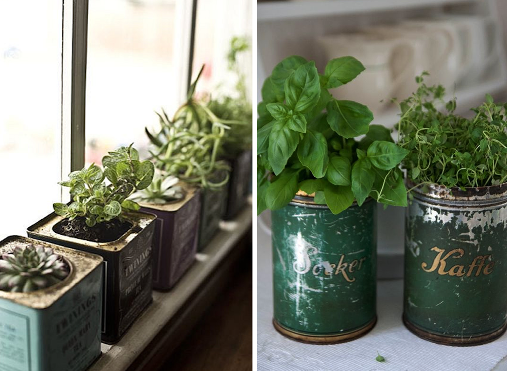 Elsa Billgren är till exempel en fena på att se en vas i allt inklusive de mest oväntade föremål, och börjar man tänka på det sättet så öppnar sig plötsligt helt andra möjligheter för det mesta man har omkring sig. Att gamla plåt- och konservburkar kan bli krukor är förstås ingen ny idé, men ibland kan det vara bra att påminna sig själv om möjligheterna som finns. För visst är det rätt mysigt att plocka basilika från en vacker plåtburk? För egen del fastnade bilden till vänster på Twinings-burkarna på näthinnan första gången jag såg den (jag bloggade om den redan för sju år sen!), och varje sommar poppar den upp igen när det börjar närma sig sommarloppis-säsong …