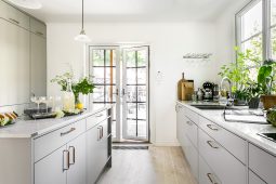 Nu blev det dags att finslipa skisserna. Rätt luckor (Svanen-märkta Arkitekt Plus från Marbodal, rätt handtag (köpta via Marbodal), en diskho och blandare i rätt stil, integrerade vitvaror för ett lugnare intryck och en nedfälld bänkfläkt för att låta köket vara så ljust och fritt som möjligt. (Saknas på bilden gör eventuell tapet och all belysning.) Här syns också nya altandörrar (inte helt rätt modell, men ett exempel), eftersom våra nuvarande är i väldigt dåligt skick och ändå behövde bytas ut – då kändes det logiskt att göra allt i samma veva för att slippa göra om något arbete senare.
